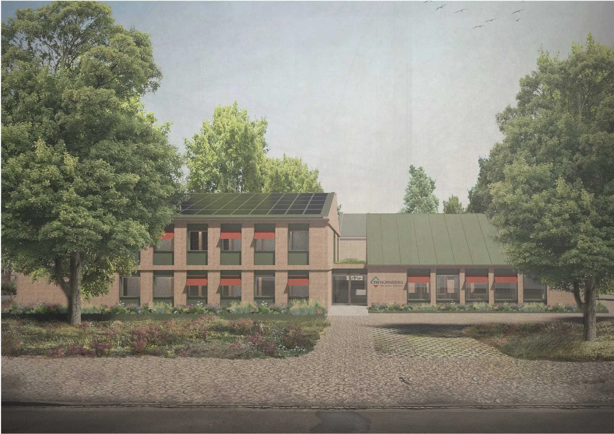 Die Geschäftsstelle des Siedlungswerks Nürnberg wird im Sinne eines behutsamen „Weiterbauens“ erneuert und erweitert. Der Entwurf respektiert die bestehende Substanz mit ihrer klaren Struktur und wertigen Materialität und ergänzt sie um funktionale, ökologische und architektonisch harmonische Bauteile. Dabei entsteht ein Ensemble, das die unterschiedlichen Maßstäbe der Umgebung vermittelt und mit neuen Wohnformen, einem erweiterten Konferenzpavillon sowie modernen Büro- und Arbeitswelten eine zukunftsweisende Nutzung ermöglicht. Besonderes Augenmerk liegt auf der städtebaulichen Einbindung, der Stärkung des zentralen Schauhofs und der Schaffung flexibler Raumqualitäten, die das Arbeiten im Grünen fördern.